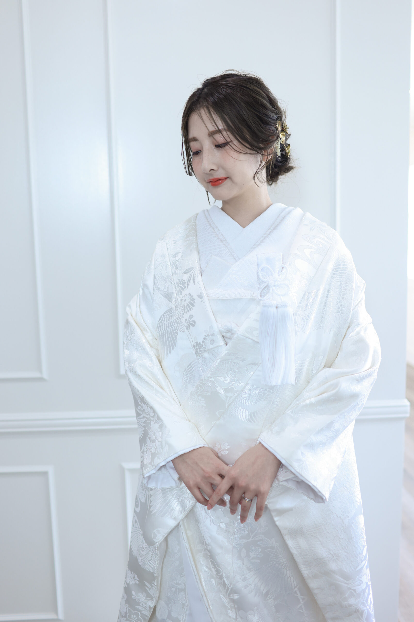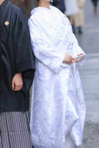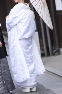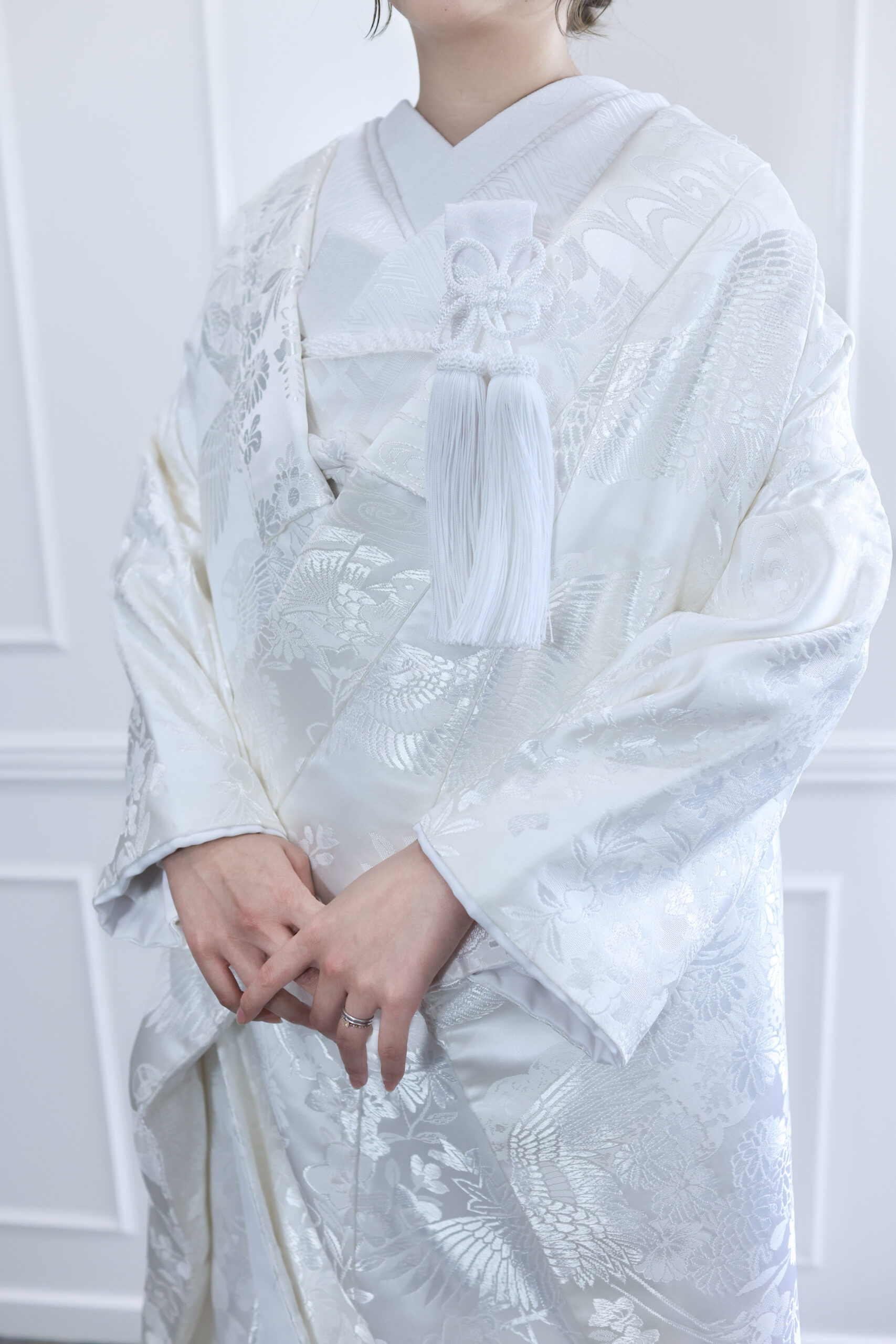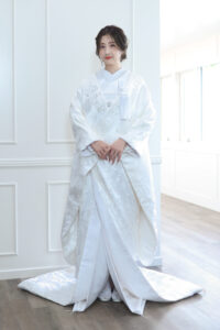 < > 白無垢6 COLOR 白 SIZE FREE PRICE 75,000yen (税込82,500yen) 白さレベル10段階中:8 当店の白無垢の中で1番白い白無垢 布地と刺繍どちらも光沢感のある生地で自然光の下では少し青みがかって見えます。